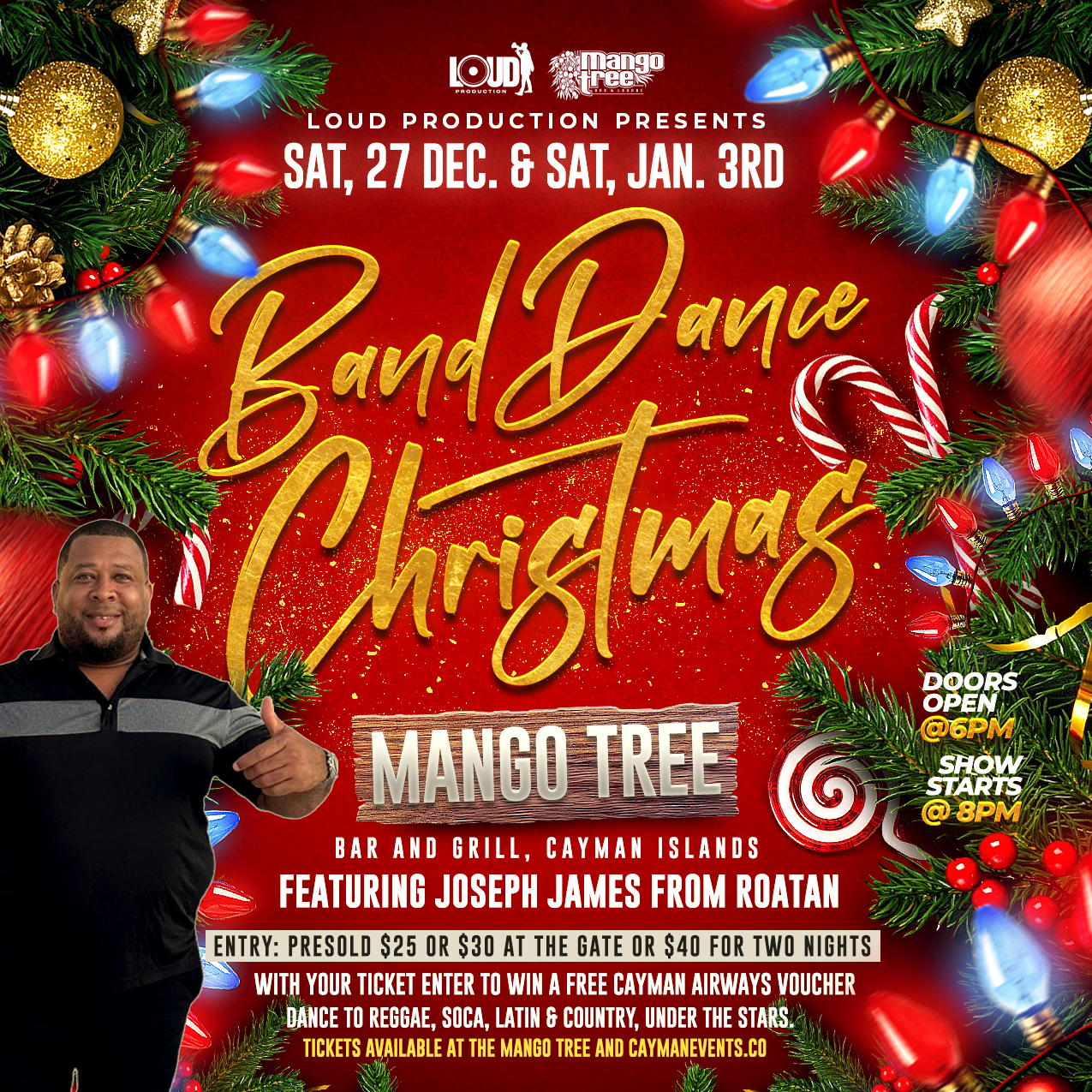 Get ready Cayman! On Saturday December 27 and January 3rd.. dont you miss “Band Dance Christmas” at The Mango Tree, featuring Joseph James from Roatan, Honduras. Singing the best in Calypso, Reggae, Country, Latin and all of the favorites you know. pre-sold tickets $25 and $30 at the gate, or enjoy both nights for just $40 dollars.